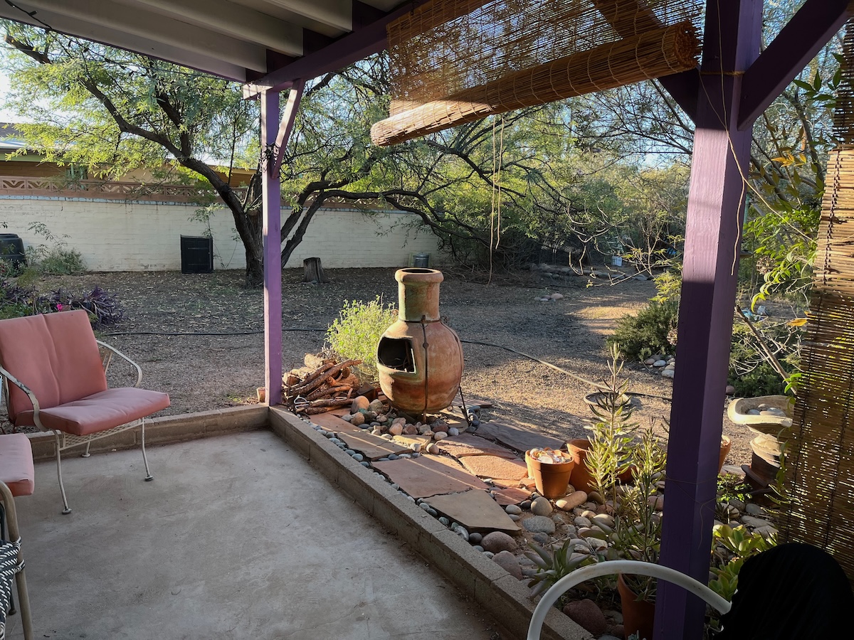 Your private space includes two unfurnished bedrooms with closets, approximately 425 sf, separated from common areas by hallway and doors. Full bathroom shared part-time. The common areas are low-scent, low-tech/media. Other than the chiminea, house and yard are smoke-free.