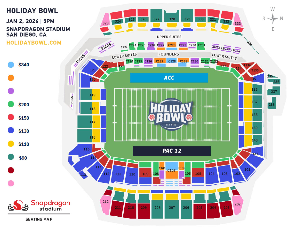 Tickets for the Holiday Bowl will be available to purchase online through Arizona Athletics starting tonight. Seats will be allocated based on priority points and best available within purchased price point. Tickets will be sent digitally in the week prior to the game. This Snapdragon Stadium map shows Arizona sections and pricing.